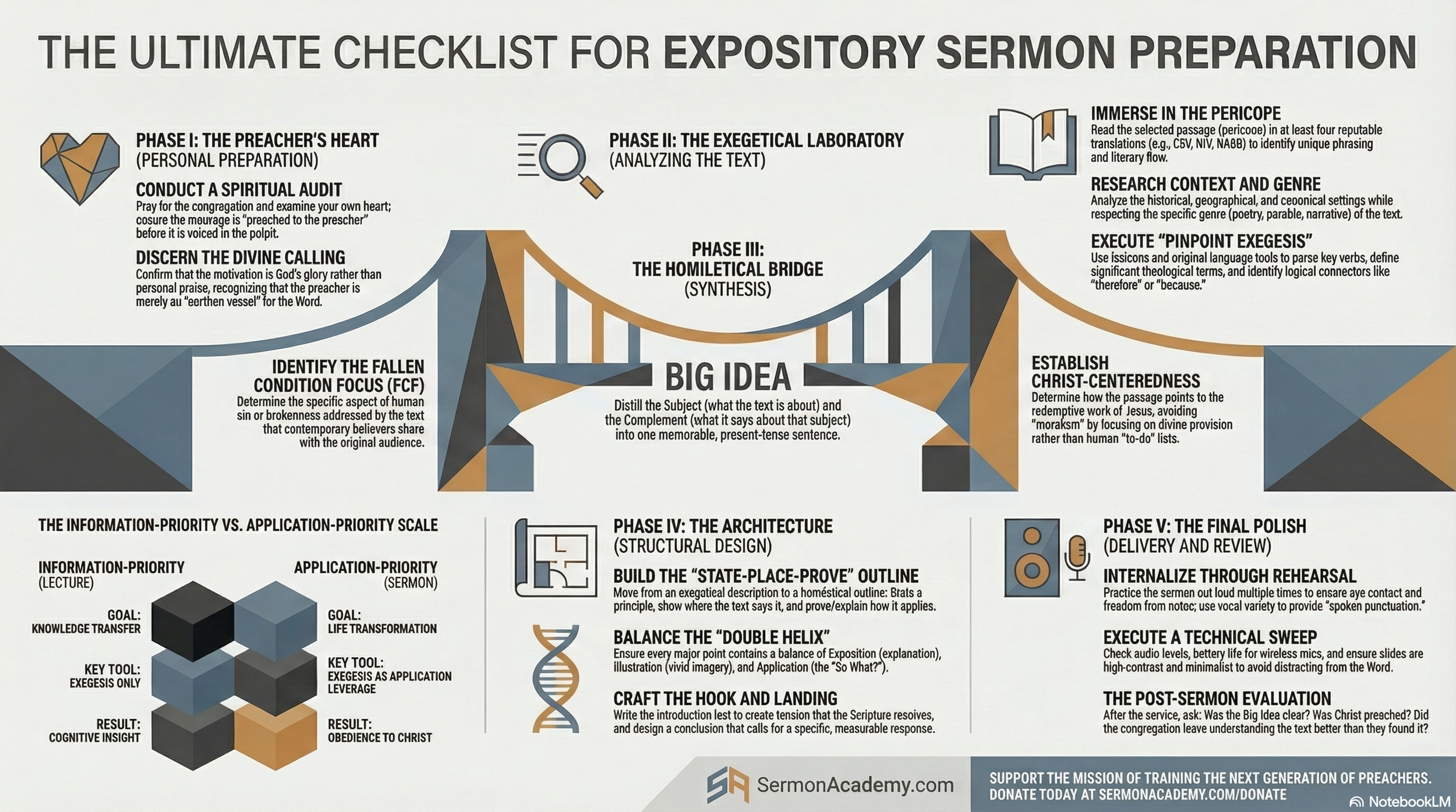 This study guide provides a comprehensive review of the principles and methodologies of sermon preparation, drawing from the insights of leading homileticians including Bryan Chapell, Haddon Robinson, Wayne McDill, and Tim Keller.